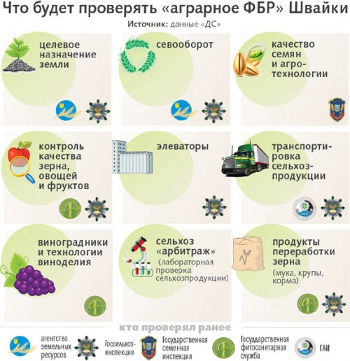 Новая структура будет проверять все, начиная от состояния почвы и "правильности" аграрных технологий и семян, и заканчивая урожаем и продуктами его переработки. Ей передадут полностью или частично функции целого ряда ведомств - Агентства земельных ресурсов, ветеринарной и фитосанитарной службы, Службы охраны прав на сорта растений и др. Для начала Госсельхозинспекция проведет инвентаризацию и аудит земель сельскохозяйственного назначения, лесного и водного фондов, рекреационных зон. Цель этого масштабного проекта - выявить хозяйства, которые используют угодья не по целевому назначению, и наказать их. Для контроля качества урожая планируется создать за бюджетные деньги сеть специализированных лабораторий (по одной в каждой из областей). Госсельхозинспекция возьмет на себя также роль "аграрного аудитора" - будет решать спорные вопросы между производителями сельхозпродукции и ее покупателями.