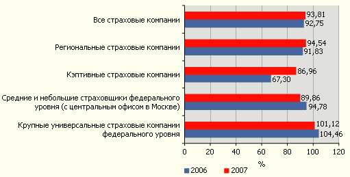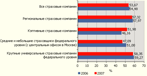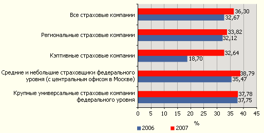 В 2007 году на российском страховом рынке наблюдалось снижение усредненного уровня убыточности-нетто (без учета РВД)3 с 54,5 до 53,7% по всем страховщикам. Возможно, мы наблюдаем смену тренда: наконец-то от демпинга и некорректной тарификации мы начали переходить к взвешенной тарифной политике, дифференциации тарифов и приведению их в соответствие с реальной убыточностью по отдельным страховым продуктам.