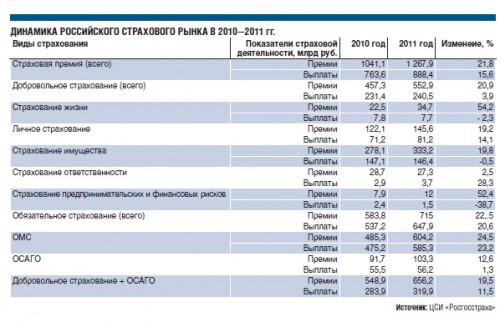 Рынок страхования по итогам прошлого года составил 1,3 трлн руб., увеличившись на 21,8% по сравнению с 2010 годом, при этом выплаты увеличились на 15,6%, достигнув 888,4 млрд руб. По мнению руководителя ЦСИ «Росгосстраха» Алексея Зубца, такое соотношение премий и выплат является адекватным, поскольку на растущем рынке премии всегда опережают выплаты. «Выплаты и собранные премии — разные показатели, но когда это соотношение из года в год повторяется, а коэффициент выплат ежегодно понижается, это негативная тенденция», — заявлял неделей ранее руководитель ФСФР Дмитрий Панкин. По подсчетам службы, коэффициент выплат в 2009 году составлял 56%, снизившись в 2010 году до 53%, а в прошлом году — до 46%.