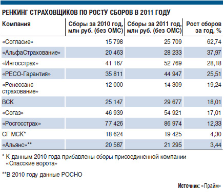 Как рассказал вчера старший вице-президент «Росгосстраха» Владимир Нечепа, компания планирует по итогам текущего года увеличить сборы примерно на 30%, до 115 млрд руб. По его словам, рост премий произойдет за счет ОСАГО (на 26—28%) и добровольного страхования (без учета ОМС — более чем на 15%). В прошлом году бизнес «Росгосстраха» (без учета «Росгосстраха — Жизнь») рос более скромными темпами — 12,3% (см. таблицу). Кроме того, компания планирует увеличить сборы по страхованию жизни минимум в два раза, цитирует г-на Нечепу РИА Новости. Прирост по сборам «Росгосстраха — Жизнь» в прошлом году составил 74,3%, компания собрала 5,96 млрд руб.