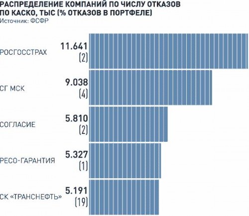 По абсолютному количеству отказов в выплате первое место занял "Росгосстрах" - 51 553 отказа. Однако у компании в то же время и самое большое число действующих договоров - 25,1 млн, поэтому доля отказов в выплате у страховщика небольшая и составляет менее 0,21%. Второе место по количеству отказов заняла компании "Альянс", доля отказов в портфеле договоров составляет менее 0,46%, третье место - СГ МСК с долей 0,35%, четвертое - "РЕСО-Гарантия" (0,27%), пятое - "Ингосстрах" (0,23%). Что касается отказов в выплатах по договорам ОСАГО, первое место также занял "Росгосстрах" (31 965 отказов с долей 0,23%), за ним с большим отрывом по числу следуют "Альянс" (4801), "РЕСО-Гарантия" (4404), ВСК (3492) и СГ МСК (2991). "Росгосстрах" занимает и первое место по числу отказов по КАСКО - 11 641 отказ.