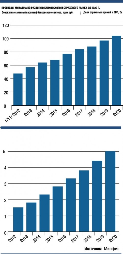 По данным ЦБ, на начало декабря прошлого года совокупные активы российских банков составляли 47,6 трлн руб. Чтобы достичь прогнозной величины, ежегодный прирост кредитного сектора должен быть на уровне 10—15% в год. По итогам 2013 года активы банков, по расчетам Минфина, вырастут до 57 трлн руб.