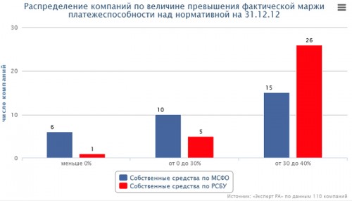 Не взятые нормативы: проблемы с капитализацией имеют как минимум 15% страховщиков. Из 110 анализируемых страховых компаний2 лишь 6 страховщиков (5%) не смогли выполнить норматив по марже платежеспособности на 31-е декабря 2012 года. То есть у этих компаний отношение скорректированного размера собственных средств и нормативного размера маржи платежеспособности было меньше 1,3. Однако реальная ситуация куда более опасна: размер собственных средств по РСБУ может завышаться по причине недорезервирования и неполного учета обесценения активов. Если же для расчета норматива по марже платежеспособности использовать собственные средства, рассчитанные по МСФО, то число «проблемных» компаний заметно увеличится – с 6 до 16 компаний (14,5% от всех анализируемых страховщиков).