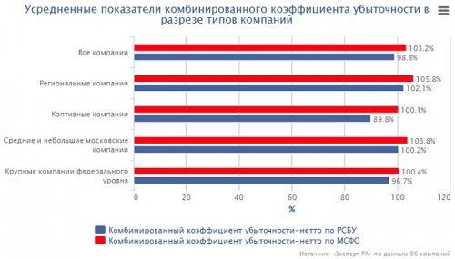 Скрытые риски: средняя убыточность по МФСО на 4,4 п.п. выше чем по РСБУ. Так, усредненный показатель комбинированного коэффициента убыточности по РСБУ с учетом суброгации в 2012 году составил 98,8%1. Аналогичный показатель по МСФО был равен 103,2%. Резервы по РСБУ рассчитываются в соответствии с приказами Минфина, тогда как резервы по МСФО определяются более точно, в том числе на основе внутренних актуарных моделей. Таким образом, реальные страховые риски российских страховщиков выше, чем это видится из отчетности по РСБУ. При этом наиболее заметные отличия имеют кэптивные компании (89,9% по РСБУ, 100,1% по МСФО), специализирующиеся на ДМС и страховании имущества юридических лиц.