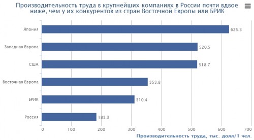 Производительность труда в компаниях из списка «Эксперт-400» составляет в среднем 183 тыс. долл. на человека, что в 3,4 раза меньше чем в крупнейших компаниях Японии, почти в 3 раза меньше, чем у лидеров Западной Европы и США и в 1,7 раза меньше, чем у ведущих корпораций из стран -- наших партнеров по БРИК. При этом существующее преимущество перед странами СНГ по производительности становится все более эфемерным - отрыв от крупнейших компаний Казахстана не превышает 2%. Более того, в топ-10 по уровню производительности труда в СНГ представлено шесть казахстанских компаний. Такой успех обусловлен тем, что большинство из них являются дочерними структурами крупных иностранных компаний, оперирующих в секторе нефтегазодобычи.
